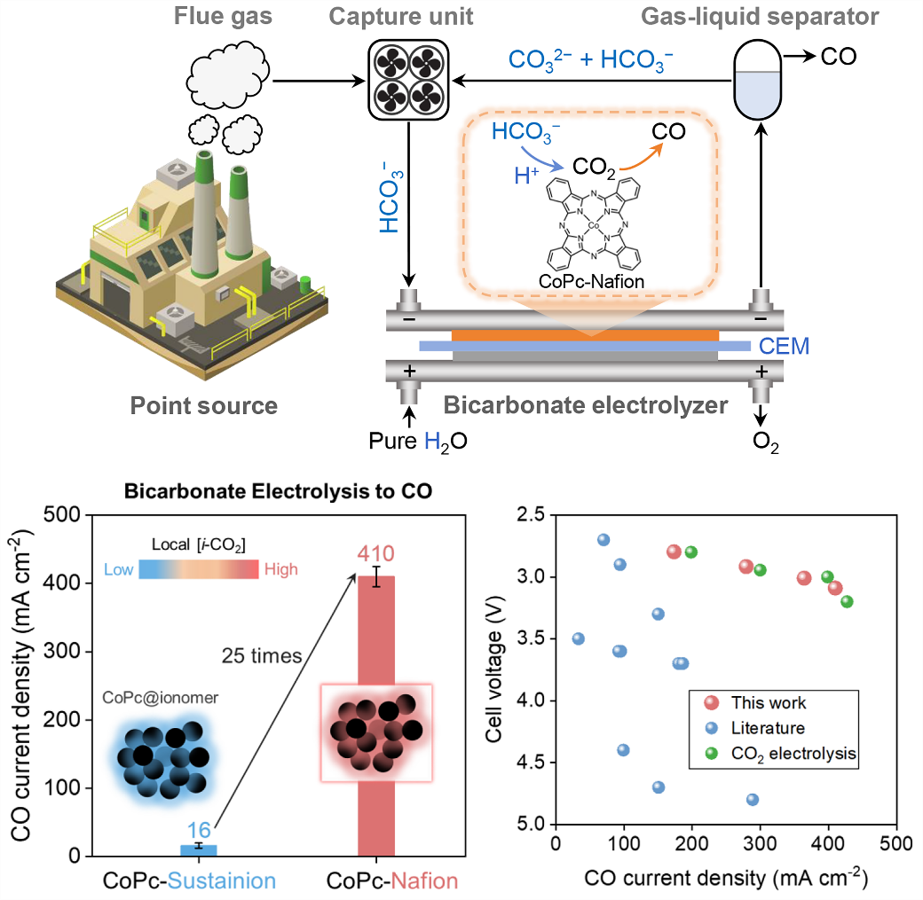 In a study published in Angewandte Chemie International Edition, a research team led by Profs. BAO Xinhe, GAO Dunfeng, and ZHANG Guohui from the Dalian Institute of Chemical Physics (DICP) of the Chinese Academy of Sciences (CAS), along with Prof. WANG Guoxiong from Fudan University, achieved efficient bicarbonate-mediated integrated carbon dioxide (CO2) capture and electrolysis to CO through an ionomer-driven reaction microenvironment control strategy. Traditional CO2 capture and conversion routes from industrial flue gas typically follow a “capture-release-compression-electrolysis” tandem pathway. The bicarbonate-mediated integrated CO2 capture-electrolysis route, as an emerging reactive carbon capture technology, couples upstream CO2 capture with subsequent electrocatalytic conversion, reducing the energy consumption associated with obtaining high-purity CO2 feedstock. The electrolysis of bicarbonate capture liquids is a crucial step in the bicarbonate-mediated integrated CO2 capture-electrolysis route. However, this step suffers from insufficient current density (low reaction rate) and high cell voltage (low energy efficiency) . Ionomer-driven reaction microenvironment control in bicarbonate-mediated integrated CO 2 capture and electrolysis © RONG Youwen In this study, the researchers manipulated the reaction microenvironments by introducing ionomers into cobalt phthalocyanine (CoPc) electrodes, improving the performance of bicarbonate electrolysis. In a cation exchange membrane-based zero-gap electrolyzer, the CoPc electrode modified with a Nafion ionomer exhibited a high CO Faradaic efficiency of 93% at an applied current density of 300 mA cm−2 and a CO partial current density of 410 mA cm−2 at a low cell voltage of 3.09 V. Electrode structure characterization and finite element simulation results demostrated that the proton conductivity of the Nafion ionomer increased the local concentration of in situ generated CO2 (i-CO2) in the proximity of the CoPc catalyst, resulting in improved CO formation. Furthermore, the researchers demonstrated a closed-loop CO2 capture and electrolysis cycle at the device level using the Nafion-incorporated CoPc electrode and a simulated flue gas. “Our study shows the potential of the reaction microenvironment control strategy for improving bicarbonate electrolysis performance and advancing reactive carbon capture technology,” said Prof. GAO. Source Dalian Institute of Chemical Physics, Chinese Academy of Sciences, press release, 2026-01-13. Supplier Chinese Academy of Sciences (CAS) Dalian Institute of Chemical Physics (DICP) Fudan University Share Renewable Carbon News – Daily Newsletter Subscribe to our daily email newsletter – the world's leading newsletter on renewable materials and chemicals Subscribe