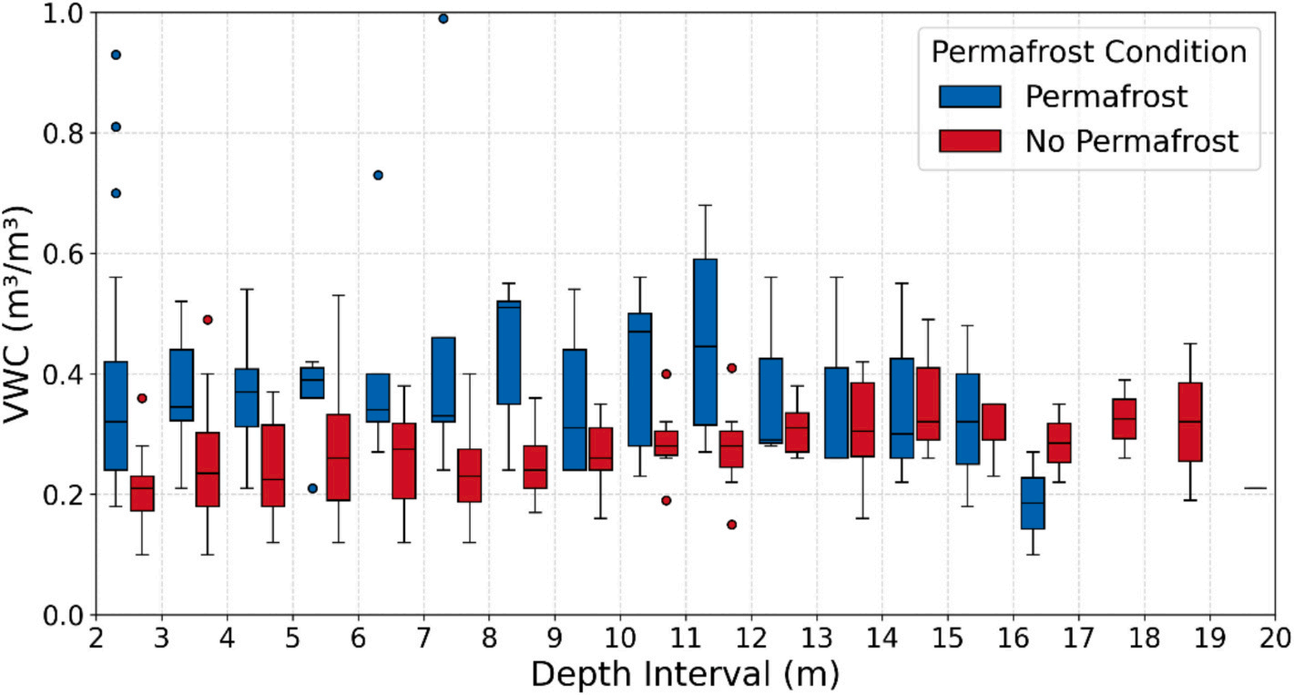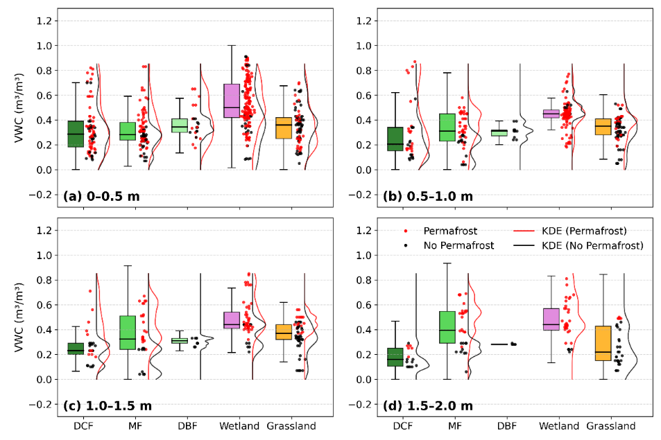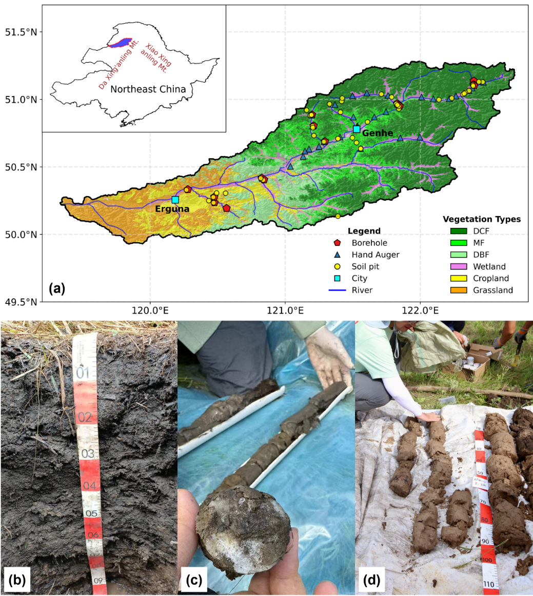 研究团队在根河流域布设75个浅层土壤剖面和15个深达20米的钻孔,获取了覆盖森林、草地、湿地等不同下垫面的土壤含水量观测数据。并结合可解释机器学习与结构方程模型,系统揭示了边缘多年冻土区土壤水分的“垂向分层”特征及其控制机制。