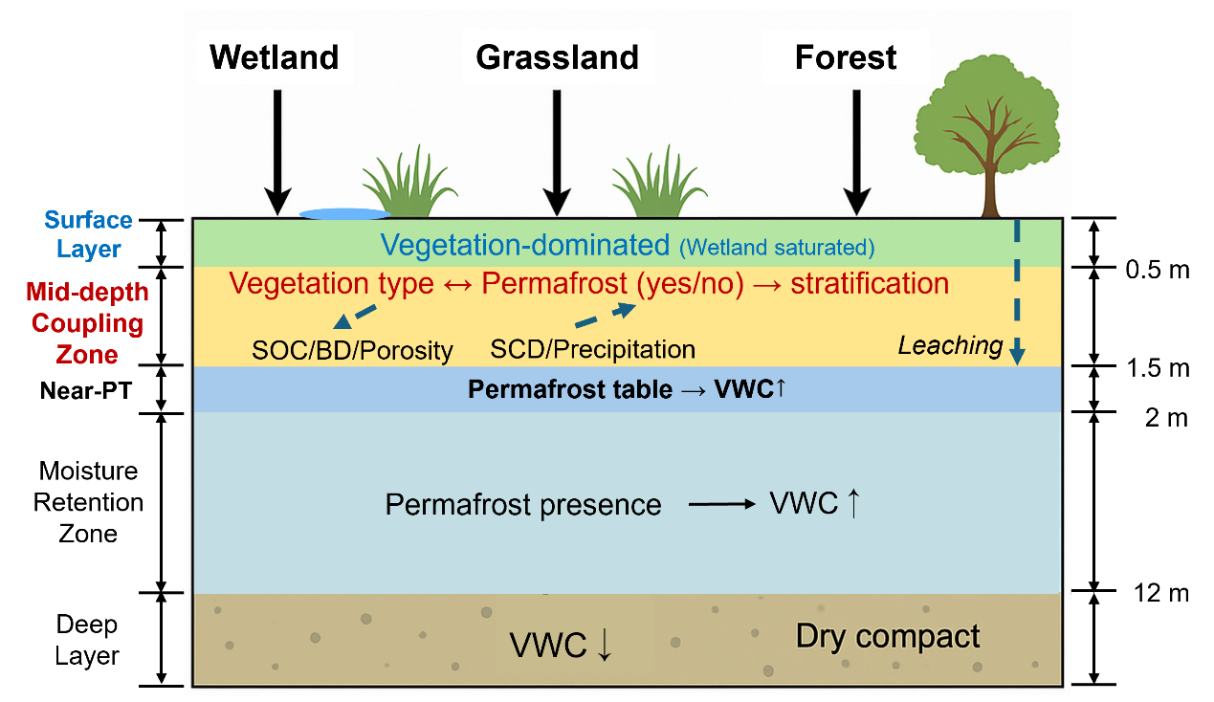 研究结果显示,湿地覆盖、土壤有机碳等地表与土壤属性主导了浅层水分分布,土壤容重和多年冻土分布控制了深层蓄水与水分维持。气候因子则主要通过改变地表温度条件与冻融过程,间接影响水分结构与分层格局。