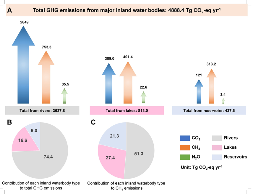 图7 全球不同类型内陆水体温室气体排放量及贡献
